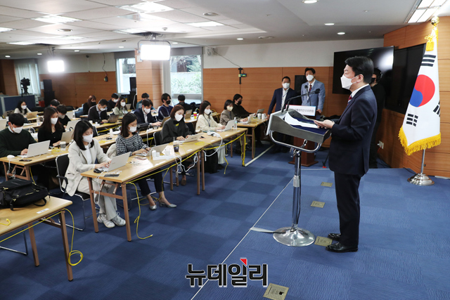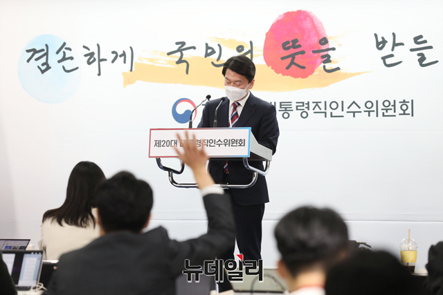 안철수 대통령직인수위원장이 30일 오전 서울 종로구 인수위 브리핑룸에서 코로나비상대응특별위원회 브리핑을 하고 있다. (사진=인수위)