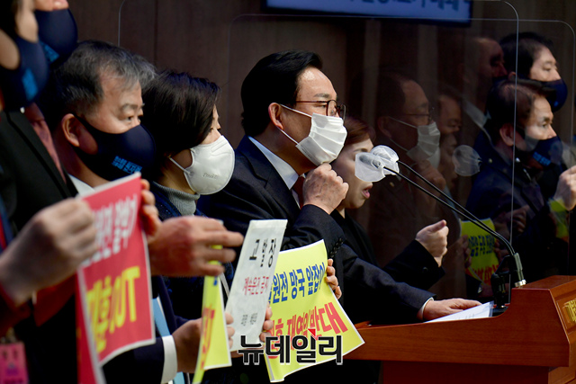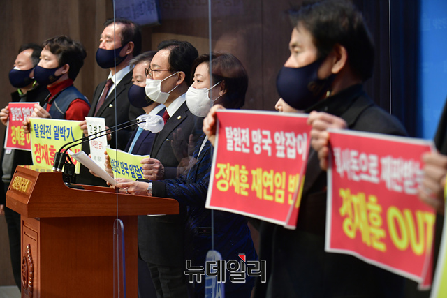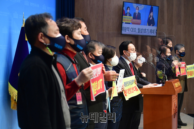 황보승희·이채익 국민의힘 의원과 탈원전 반대 시민단체 관계자들이 1일 오전 국회 소통관에서 정재훈 한국수력원자력 사장의 연임에 반대하 기자회견을 하고 있다.이날 참석자들은 "정재훈 사장이 3년의 임기와 1년의 연임을 거치는 동안 세계 최고 수준의 원전 생태계는 순식간에 무너졌다"며 "자기 손으로 원전 생태계를 망쳐 온 정 사장이 '탈원전으로 원전 생태계가 무너질 수 있다'며 걱정하는 뻔뻔한 모습이 놀라울 따름" 이라고 밝히고 "지금이라도 원전 농단의 실체를 밝히고 재판에 성실히 임해야 할 것"이라고 주장했다.