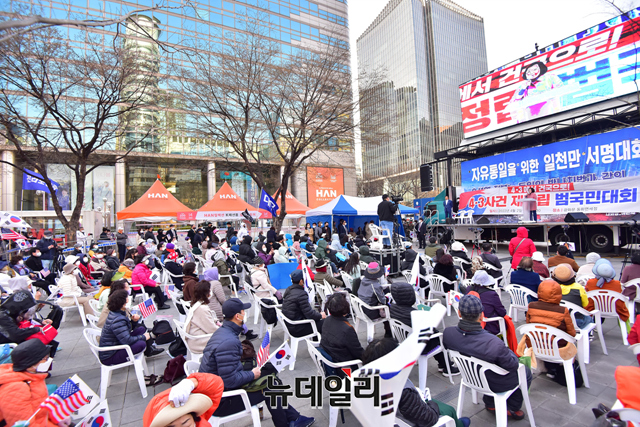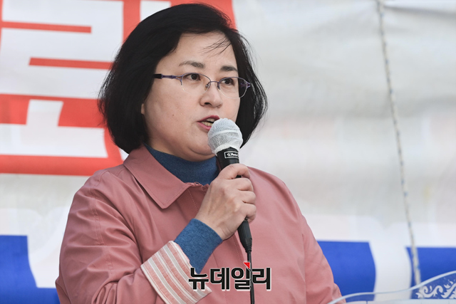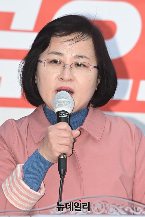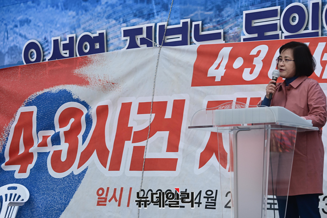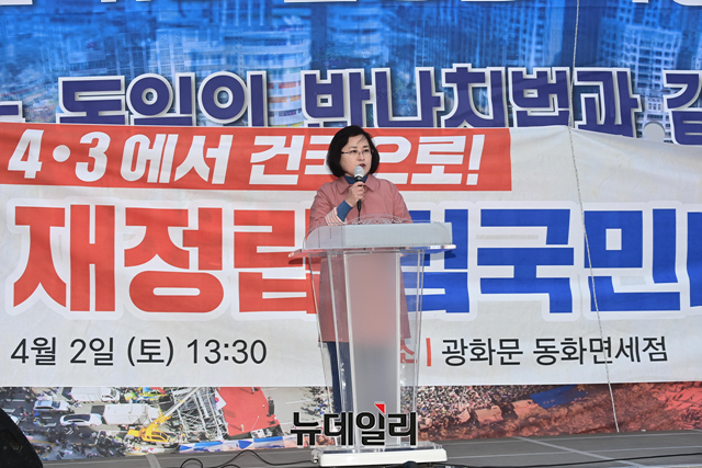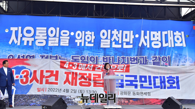 전민정 제주4.3사건재정립시민연대 대표가 2일 오후 서울 종로구 동화면세점 앞에서 열린 범국민대회에서 발언을 하고 있다.