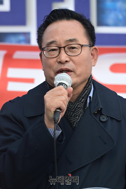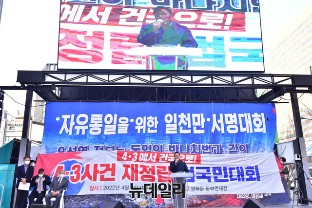 이희범 자유연대 대표가 2일 오후 서울 종로구 동화면세점 앞에서 열린 제주4·3사건 재정립 범국민대회에서 발언을 하고 있다.