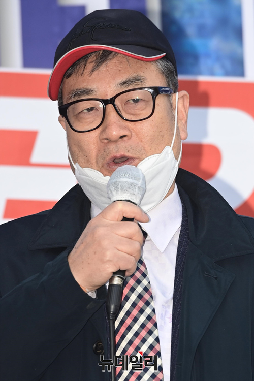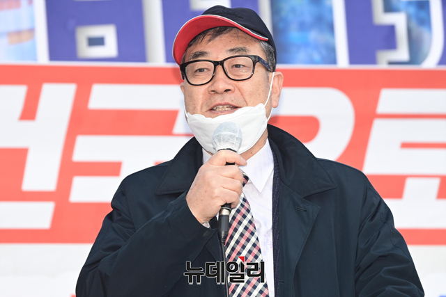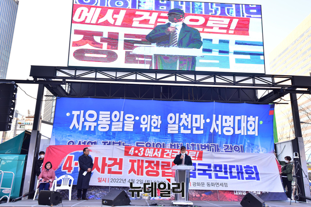 이주천 원광대 명예교수가 3일 오후 서울 종로구 동화면세점 앞에서 열린 제주4·3사건 재정립 범국민대회에서 발언을 하고 있다.