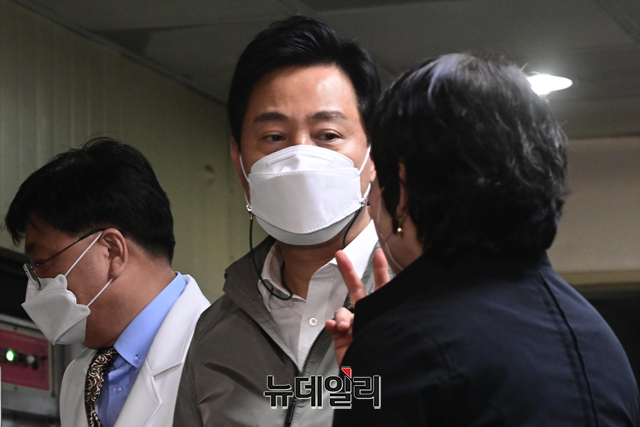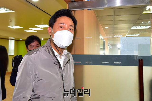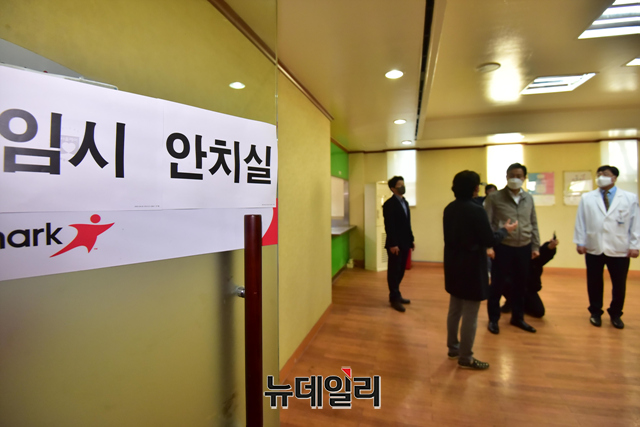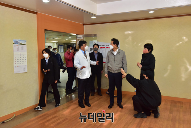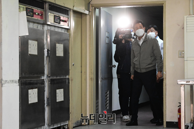 오세훈 서울시장이 3일 오전 서울 강남구 서울의료원 강남분원에 마련된 임시 안치실과 시설물을 점검하고 있다.