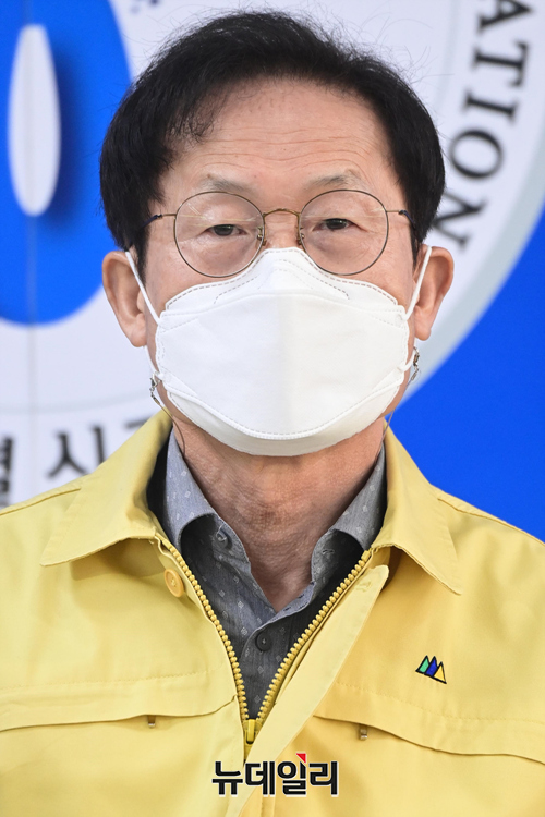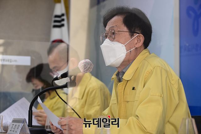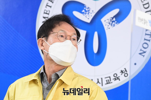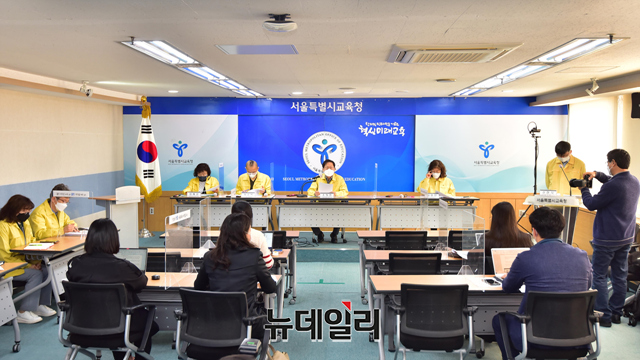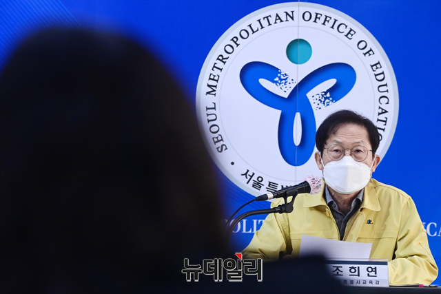 조희연 서울시교육감이 5일 오전 서울 종로구 서울시교육청 본관에서 열린 코로나19 정례 브리핑에서 발언을 하고 있다.