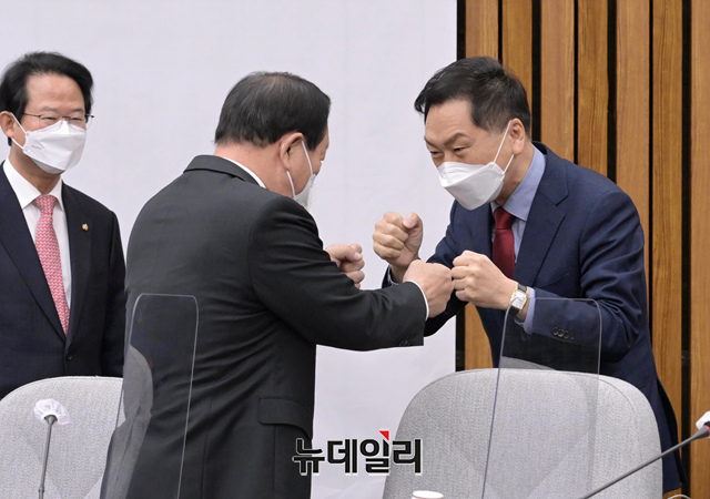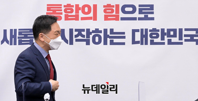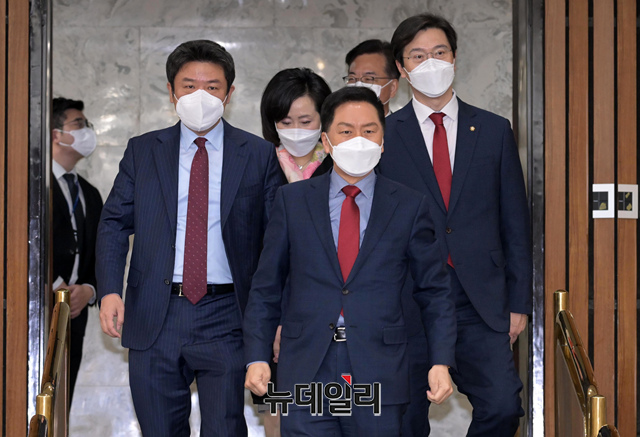 김기현 국민의힘 원내대표가 5일 오전 국회에서 열린 마지막 원내대책회의에 참석하기 위해 입장하고 있다. (사진=공동취재단)