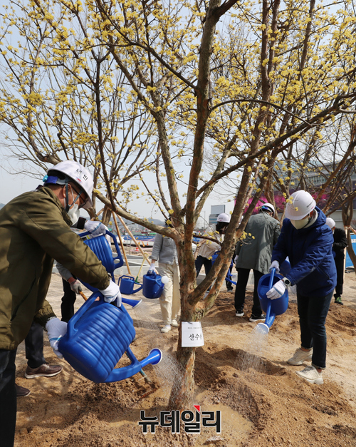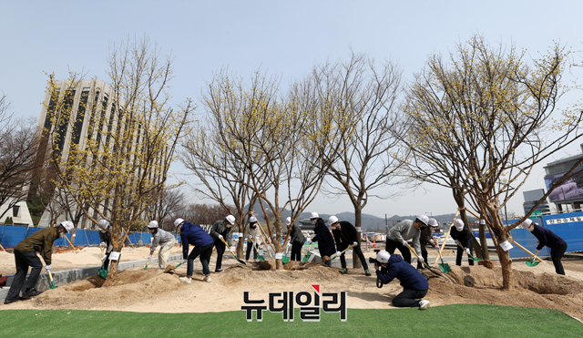 제77회 식목일인 5일 오전 서울 종로구 세종로공원 앞 사계정원에서 열린 새로운 광화문광장 조성 식목행사에서 오세훈 서울시장을 비롯한 참석자들이 산수유 나무를 심고 있다.
