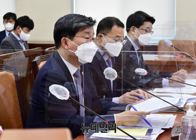 전해철 행정안전부 장관이 5일 오전 국회에서 열린 행정안전위원회 전체회의에 참석해 의원들의 질문에 답하고 있다. (사진=공동취재단)