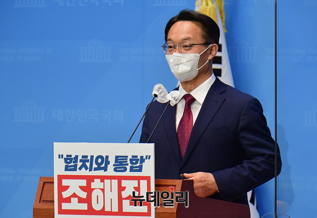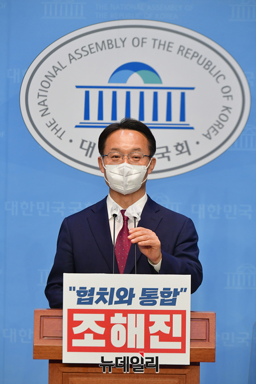 조해진 국민의힘 의원이 5일 오전 국회 소통관에서 국민의힘 원내대표 출마 선언을 하고 있다.