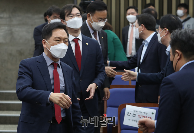 김기현 국민의힘 원내대표가 5일 오후 국회에서 열린 의원총회에 참석해 의원들과 대화를 나누고 있다. (사진=공동취재단)