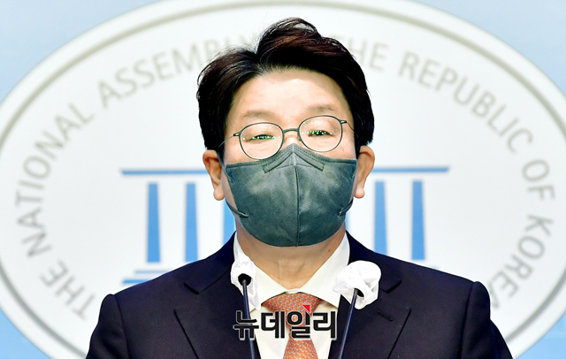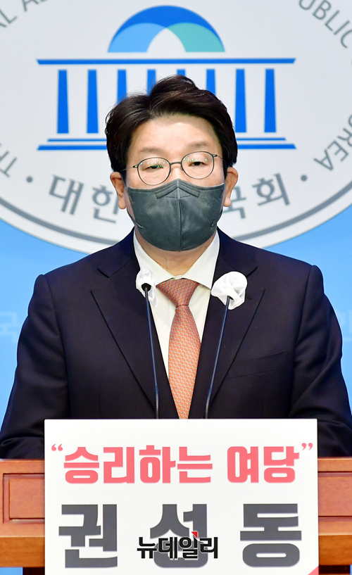 권성동 국민의힘 의원이 5일 오후 국회 소통관에서 기자회견을 갖고 국민의힘 원내대표 출마 선언을 하고 있다.