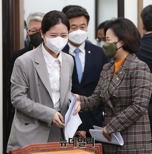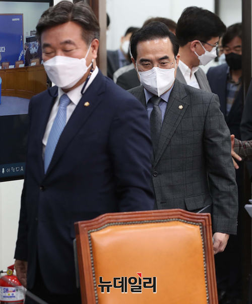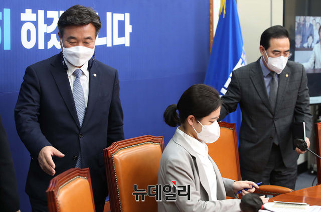 윤호중·박지현 더불어민주당 공동비상대책위원장과 박홍근 원내대표가 6일 오전 국회에서 열린 더불어민주당 비상대책위원회의에 참석하고 있다. (사진=공동취재단)