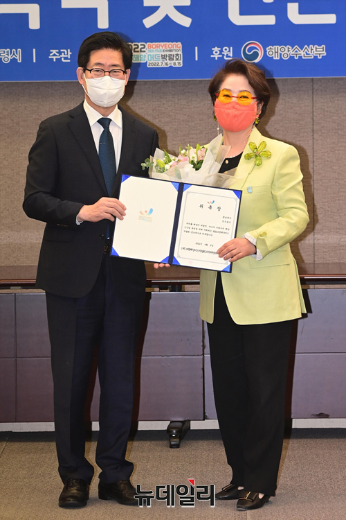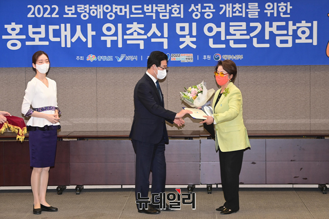 배우 선우용녀와 양승조 충남지사가 6일 오전 서울 중구 한국프레스센터에서 열린 '2022 보령해양머드박람회' 홍보대사 위촉식에서 기념촬영을 하고 있다.