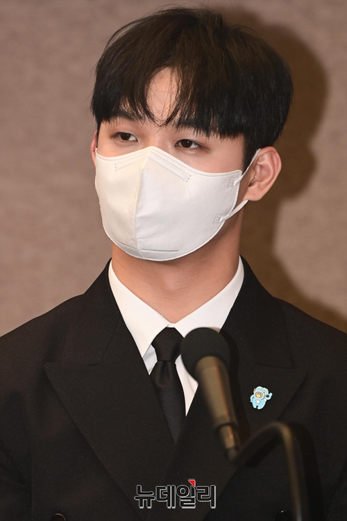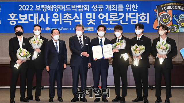 가수 비투비와 참석자들이 6일 오전 서울 중구 한국프레스센터에서 열린 '2022 보령해양머드박람회' 홍보대사 위촉식에서 기념촬영을 하고 있다.