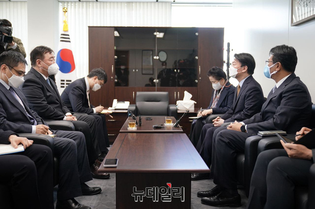 안철수 대통령직인수위원장이 6일 오전 싱하이밍 주한중국대사를 만나 인사를 나누고 있다. (사진=인수위)