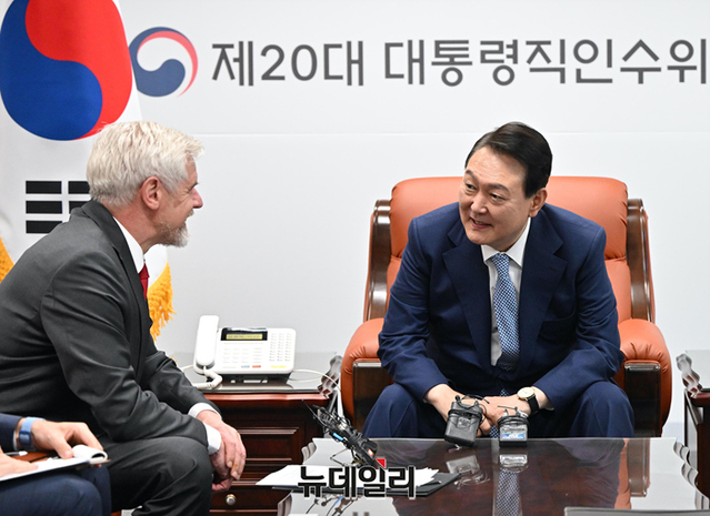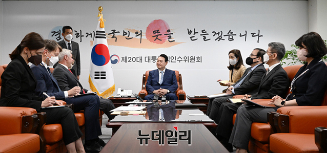 윤석열 대통령 당선인이 6일 오전 서울 종로구 통의동 제20대 대통령직인수위원회 집무실에서 미하엘 라이펜슈툴 주한 독일대사를 접견하고 있다. (사진=인수위)