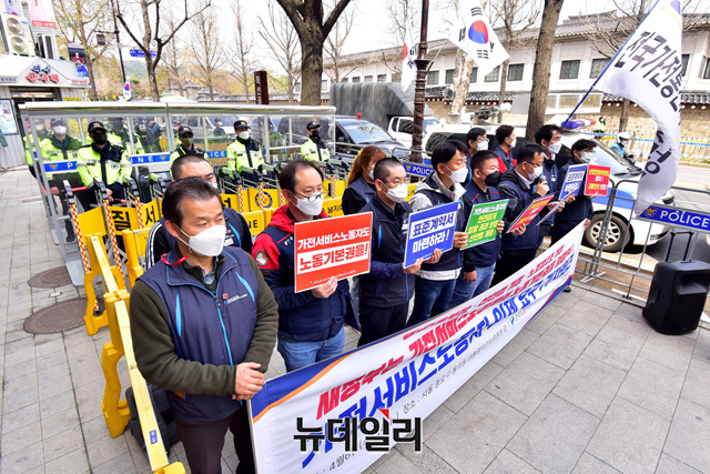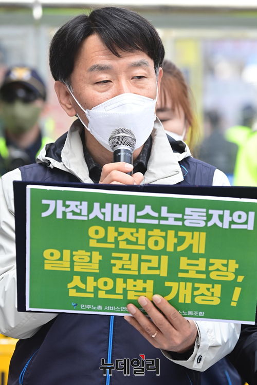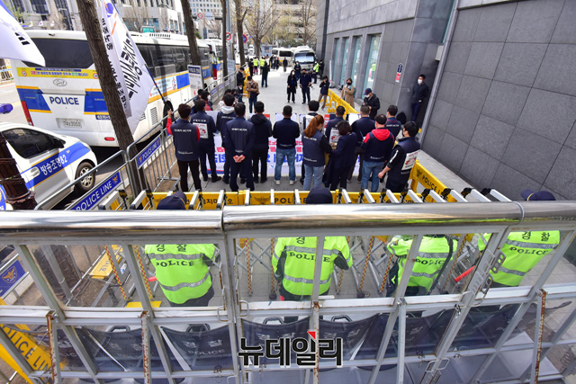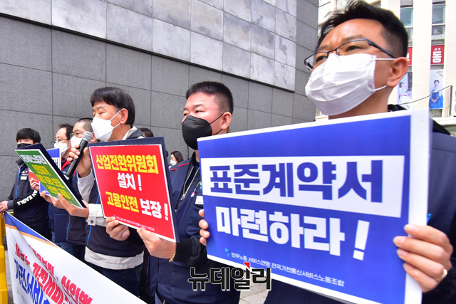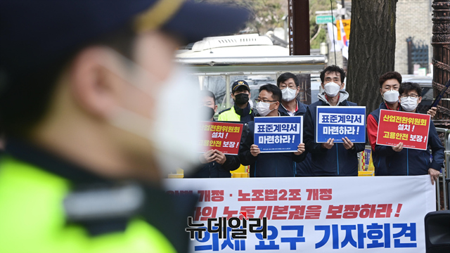새 정부 출범을 한 달여 앞두고 있는 6일 오후 서울 종로구 제20대 대통령직인수위원회 인근에서 민노총 전국서비스산업노동조합연맹이 △노동기본권 △표준 계약서 마련 △산업전환위원회 설치 △노조법 2조 개정 등을 요구하는 기자회견을 하고 있다.