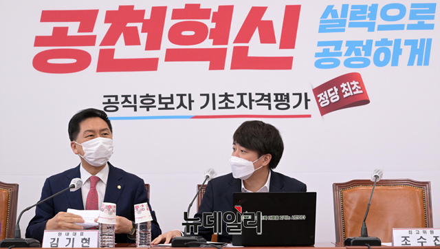 이준석 국민의힘 대표와 김기현 원내대표가 7일 오전 국회에서 열린 최고위원회의 참석하며 악수하고 있다. (사진=공동취재단)