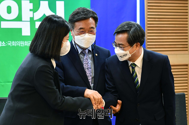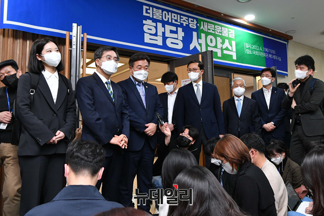 더불어민주당·새로운물결 합당 서약식이 7일 오후 국회에서 열린 가운데 박지현 민주당 공동비상대책위원장, 윤호중 민주당 공동비상대책위원장, 김동연 새로운물결 대표 등이 기념촬영을 하고 있다. (사진=공동취재단)
