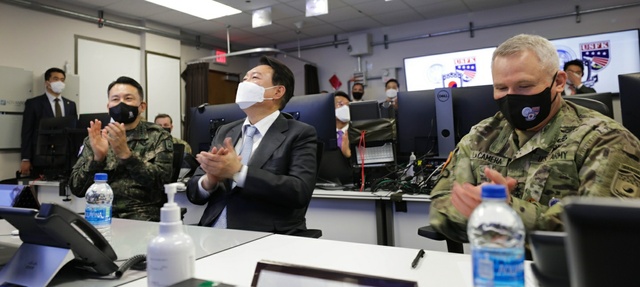 윤석열 대통령 당선인이 7일 오후 경기도 평택시 주한미군 캠프 험프리스를 방문해 폴 러캐머라 주한미군사령관 겸 한미연합사령관, 김승겸 연합사 부사령관 등을 만나 부대시설을 둘러보고 있다. (사진=주한미군 공보실)