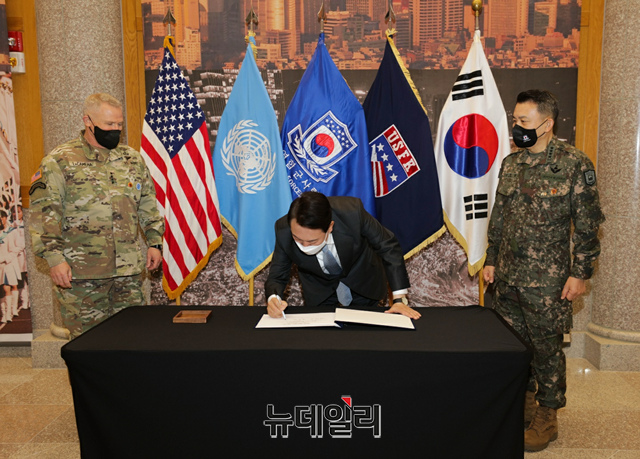 윤석열 대통령 당선인이 7일 오후 경기도 평택시 주한미군 캠프 험프리스를 방문해 폴 러캐머라 주한미군사령관 겸 한미연합사령관, 김승겸 연합사 부사령관 등과 기념사진을 촬영하고 있다. (사진=주한미군 공보실)
