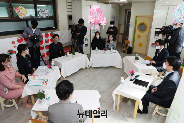 안철수 대통령직인수위위원장이 7일 오전 서울시내 한 어린이집을 방문해 보육 현장의 애로사항을 청취하고 있다. 이날 코로나비상대응특별위원회 윤영덕 위원, 신용현 인수위 대변인 등이 동행했다. (사진=인수위)