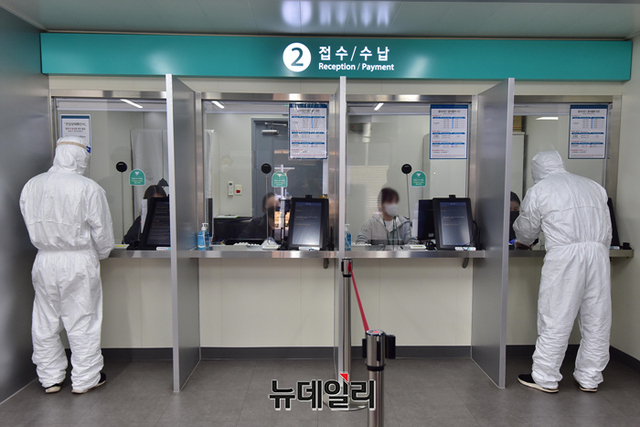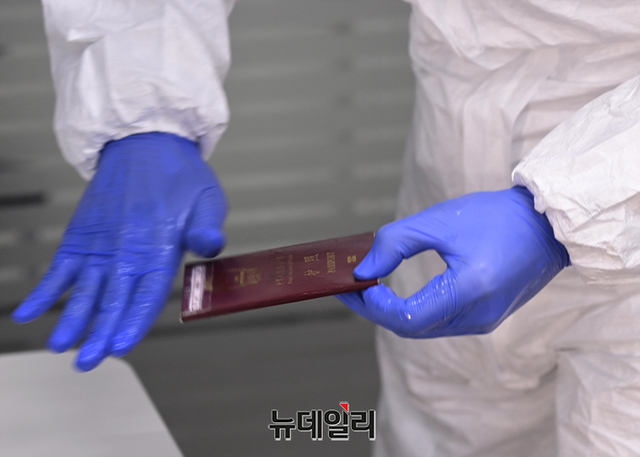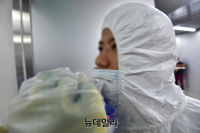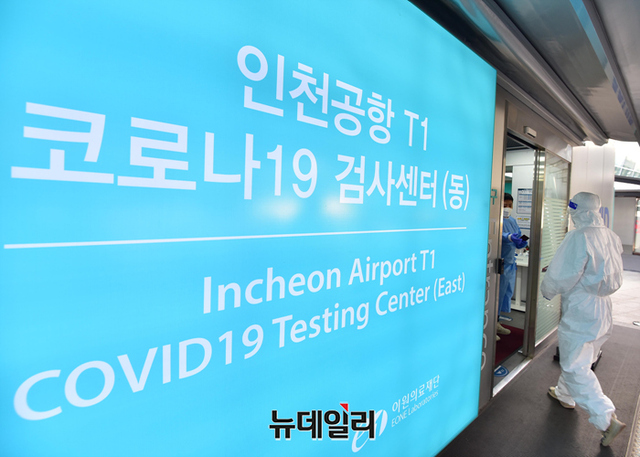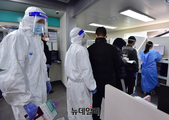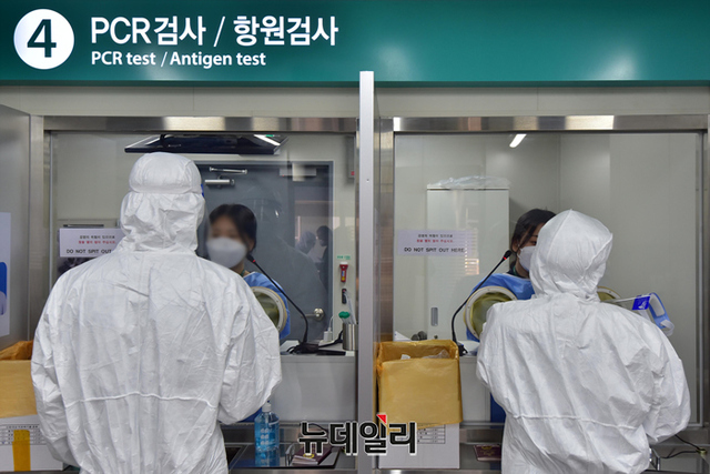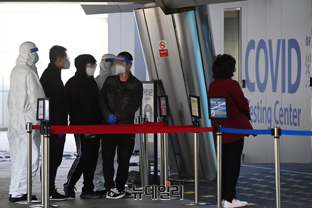 신규확진자 수가 22만 4,820명을 기록한 7일 오후 인천국제공항 제1여객터미널에 마련된 코로나19 검사센터에서 입국한 중국인들이 검체 검사를 받기 위해 줄을 서 있다. (인천=강민석 기자)