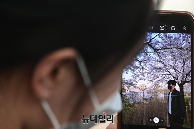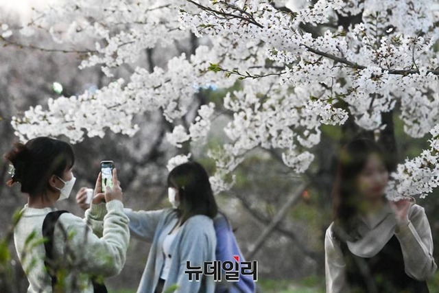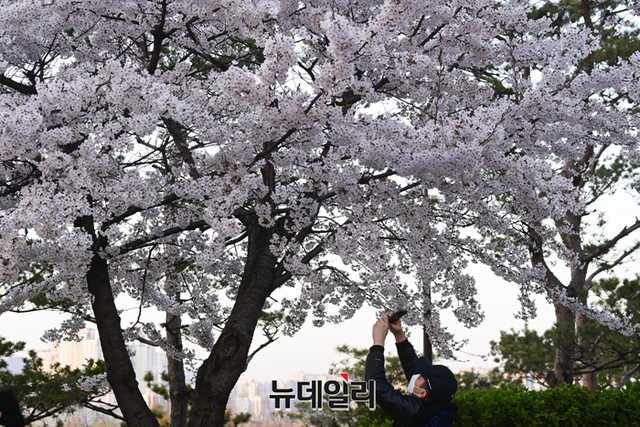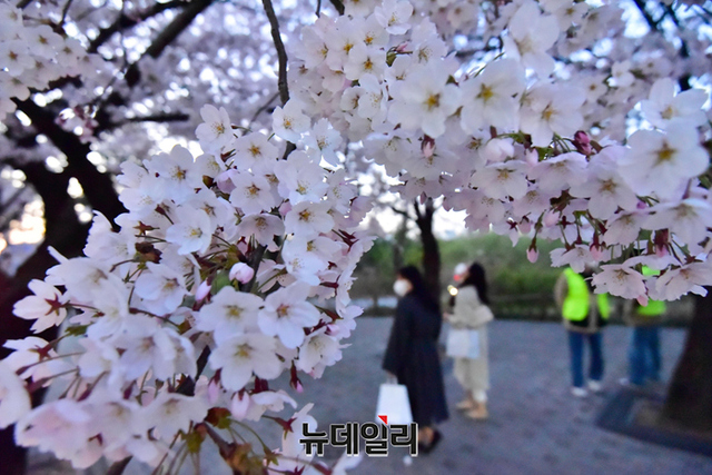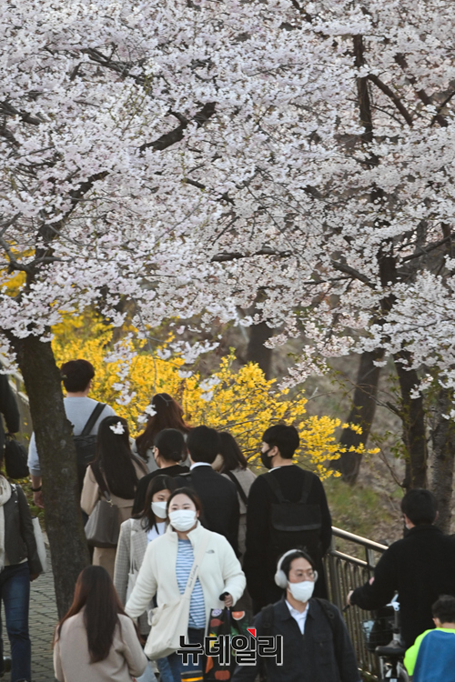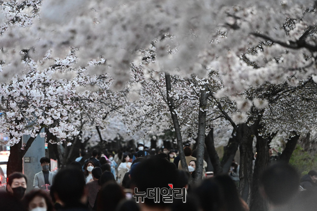 코로나19 사태 이후 3년 만에 서강대교 남단부터 국회의사당 인근까지 벚꽃길을 개방한 8일 오후 서울 여의도 벚꽃길에서 시민들이 산책을 하고 있다.