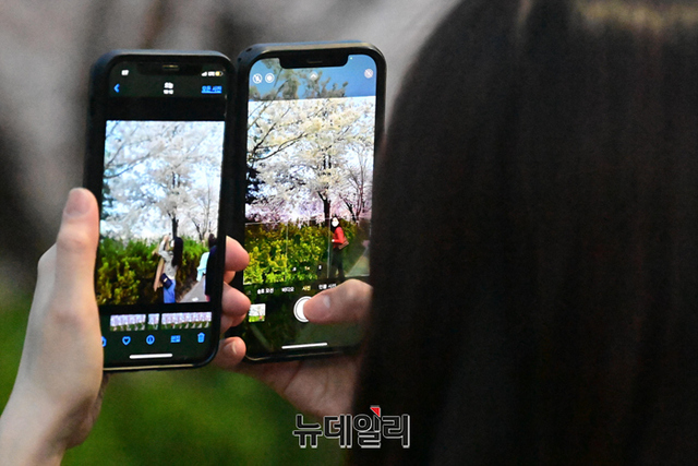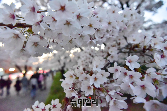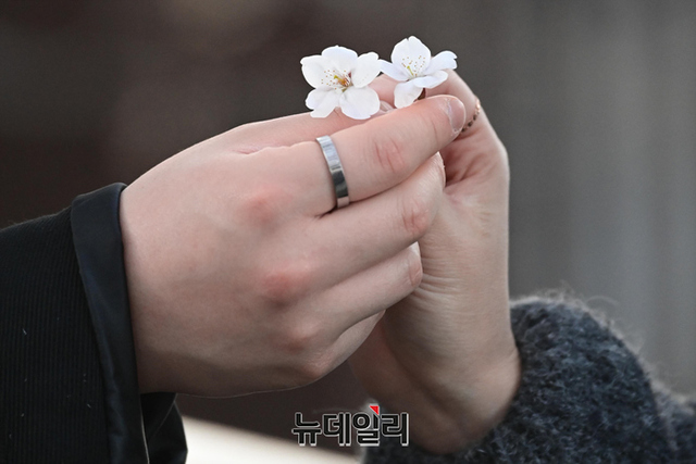 코로나19 사태 이후 3년 만에 서강대교 남단부터 국회의원 인근까지 벚꽃길이 개방된 8일 오후 서울 여의도 벚꽃길에서 한 커플이 추억을 만들고 있다.