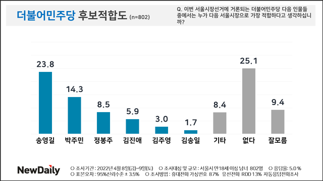 '민주당 서울시장 후보 적합도' 조사에선 '없다'가 25.1%민주당 후보 적합도 조사에서는 '없다'라는 의견이 25.1%로 최다였다. 그 뒤로 송영길 23.8%, 박주민 14.3%, 정봉주 8.5%, 김진애 5.9%, 김주영 3.0%, 김송일 1.7% 등 순이었다. '기타'는 8.4%였다.정당지지도는 민주당 42.8%, 국민의힘 35.0%, 국민의당 7.9%, 정의당 2.5% 등으로 조사됐다.