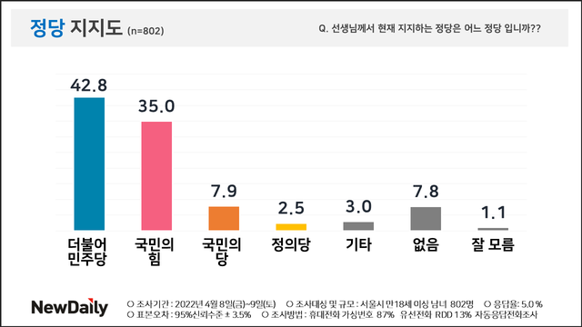 이번 조사는 뉴데일리 의뢰로 PNR이 4월 8~9일 이틀 동안 서울에 거주하는 만 18세 이상 남녀 802명을 대상으로 유무선 자동응답 전화조사 방식으로 진행했다. 휴대전화 가상번호 87%, 유선전화 RDD 13% 비율로 피조사자를 선정했으며 최종 응답률은 5.0%, 표본오차는 95% 신뢰수준에서 ±3.5%p다.여론조사의 자세한 개요와 결과는 중앙선거여론조사심의위원회 홈페이지를 참고하면 된다.