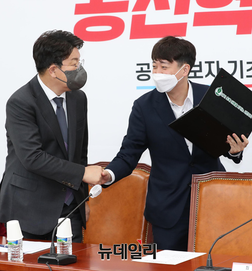 이준석 국민의힘 대표가 11일 오전 국회에서 열린 최고위원회의에 참석하며 권성동 원내대표와 악수를 하고 있다. (사진=공동취재단)