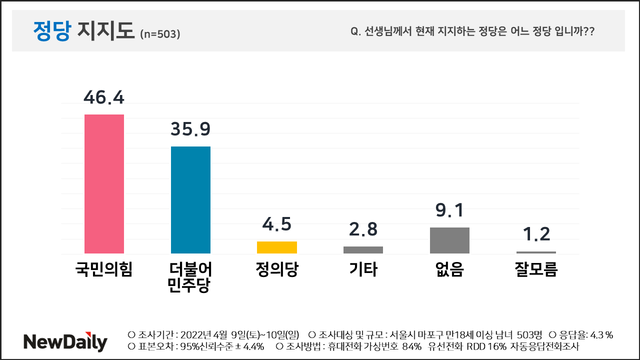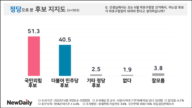 오는 6월1일에 치러지는 마포구청장선거에서 국민의힘 후보가 더불어민주당 후보를 오차범위 밖에서 앞선다는 여론조사 결과가 나왔다.뉴데일리 의뢰로 여론조사업체 PNR(피플네트웍스리서치)가 지난 9~10일 서울 마포구 유권자 503명을 대상으로 차기 마포구청장 적합도를 조사한 결과, 국민의힘 후보 지지율은 51.3%, 민주당 후보는 40.5%로 나타났다. 오차범위(95% 신뢰수준 ±4.4%p) 밖인 10.8%p 격차다. 이어 '기타' 2.5%, '지지 후보 없음' 1.9%, '잘 모르겠다' 3.8%로 집계됐다.지역별로 살펴보면, 마포구 갑선거구(공덕동·아현동·도화동·용강동·대흥동·염리동·신수동)에서는 국민의힘 후보 53.4% 민주당 후보 39.8%였고, 을선거구(서강동·서교동·합정동·망원1·2동·연남동·성산1·2동·상암동)에서는 국민의힘 후보 49.7%, 민주당 후보 41.0%였다.연령별로는 20대와 40대를 제외한 모든 연령층에서 국민의힘 후보의 지지율이 민주당 후보보다 높았다. ▲만18세~만20대 국민의힘 후보 41.6%, 민주당 후보 45.1% ▲30대 국민의힘 후보 46.4%, 민주당 후보 43.0% ▲40대 국민의힘 후보 38.3%, 민주당 후보 54.9% ▲50대 국민의힘 후보 55.5%, 민주당 후보 38.8% ▲60세 이상 국민의힘 후보 70.9% 민주당 후보 24.4%였다.