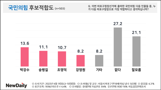국민의힘 박강수 13.6%, 송병길 11.1%, 조영덕 10.7%, 강영원 8.2%민주당 유동균 마포구청장 구정운영평가…긍정 48.8%, 부정 36%조영덕 48.3% vs 유동균 42.3%… 박강수 48.2% vs 유동균 41.9%