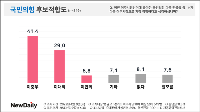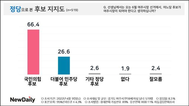 오는 6월1일로 예정된 경기도 여주시장선거에서 국민의힘 후보가 더불어민주당 후보를 오차범위 밖에서 크게 앞선다는 여론조사 결과가 나왔다.뉴데일리 의뢰로 여론조사업체 PNR(피플네트웍스리서치)가 지난 9~10일 경기도 여주시에 거주하는 만18세 이상 유권자 519명을 대상으로 차기 여주시장 적합도를 조사한 결과, 국민의힘 후보의 지지율이 66.4%로 나타났다. 이는 26.6%를 기록한 민주당 후보를 오차범위(95% 신뢰수준 ±4.3%p) 밖인 39.8%p 큰 격차로 앞선 것이다.국민의힘 소속 후보 모든 선거구에서 과반 지지국민의힘 소속 후보는 모든 선거구에서 민주당 소속 후보를 따돌렸다.구체적으로 △1선거구(여흥동·중앙동·오학동·북내면·강천면) 민주당 후보 24.9%, 국민의힘 후보 69.1% △2선거구(점동면·가남읍·세종대왕면·흥천면·금사면·산북면·대신면) 민주당 후보 29.3%, 국민의힘 후보 62.3%로 나타났다. 국민의힘 후보는 모든 선거구에서 유권자 과반의 지지를 얻었다.또 남녀 모두 민주당 후보보다 국민의힘 후보를 더 선호하는 것으로 조사됐다. 남성의 경우 민주당 후보 26.1%, 국민의힘 후보 69.2%를 각각 지지했고 여성은 민주당 후보 27.3%, 국민의힘 후보 63.4%를 지지했다.연령별로도 전 연령층에서 국민의힘 후보가 민주당 후보를 앞섰다. △만18세~20대에서는 민주당 후보 14.7%, 국민의힘 후보 71.7% △30대 민주당 후보 24.3%, 국민의힘 후보 67.6% △40대 민주당 후보 41.7%, 국민의힘 후보 53.3% △50대 민주당 후보 37.5%, 국민의힘 후보 55.1% △60세 이상 민주당 후보 19.4%, 국민의힘 후보 75.8% 등이다.