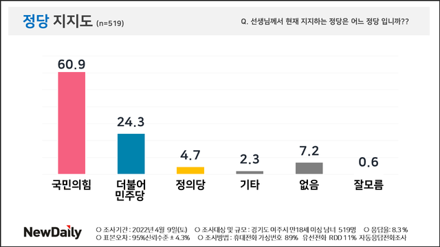 정당 지지도 국민의힘 60.9%로 압도… 더불어민주당은 24.3%국민의힘 후보적합도 조사… 이충우, 이대직, 이만희 순