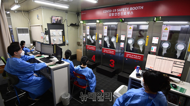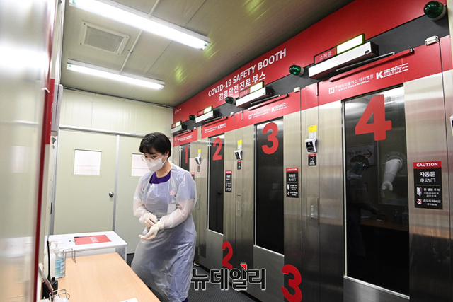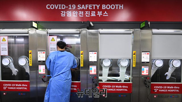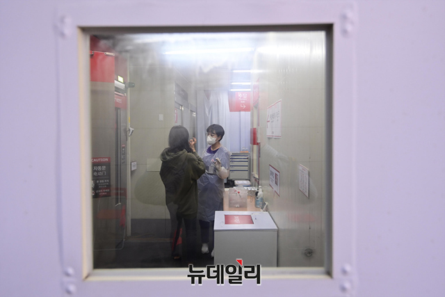 정부가 전국 선별진료소에서 시행해온 코로나19 신속항원 검사를 전면 중단한 11일 오후 서울 관악구 양지병원에 마련된 감염안전진료부스에서 의료진이 업무를 보고 있다.