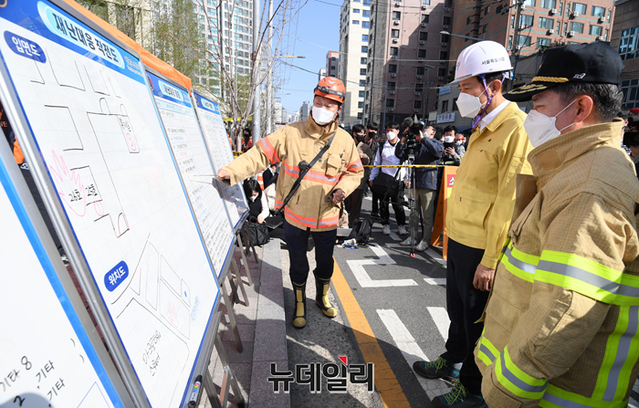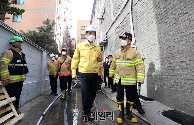오세훈 서울시장이 11일 오전 서울 영등포구 고시원 화재 현장을 찾아 관계자로부터 브리핑을 받고 있다. 앞서 이날 새벽 영등포구의 한 고시원에서 화재가 발생해 거주자 60대 남성과 70대 남성 총 2명이 사망했다. (사진=서울시)