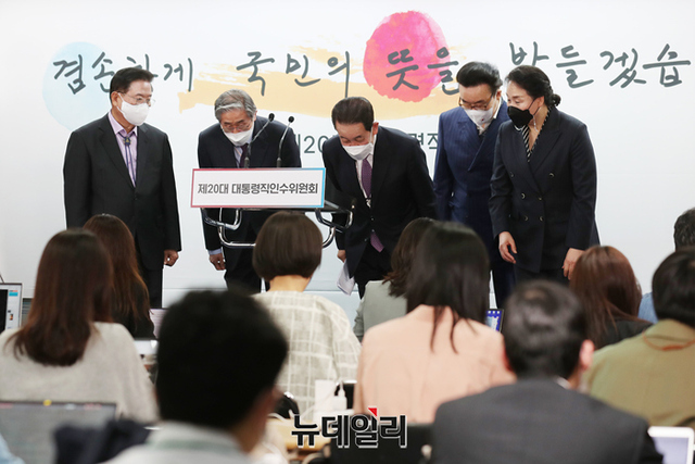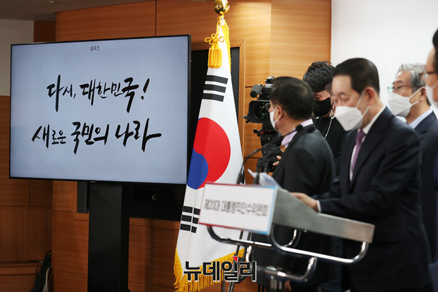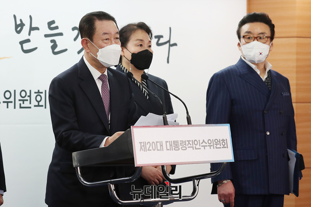 박주선 대통령취임준비위원회 위원장이 11일 오전 서울 종로구 통의동 제20대 대통령직인수위원회 공동기자회견장에서 취임식 관련 중간보고를 하고 있다. (사진=인수위)