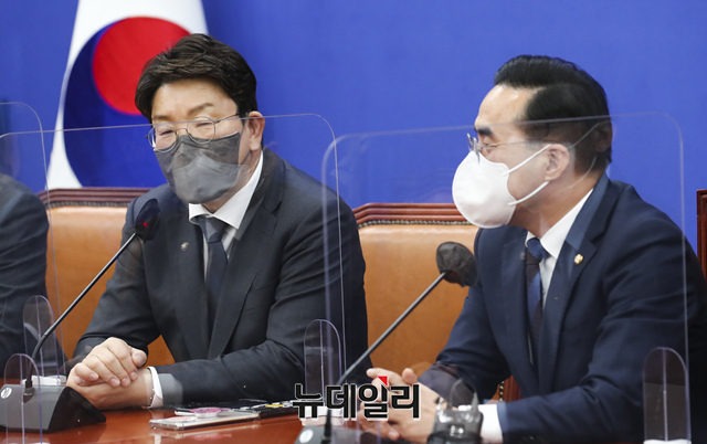 권성동 국민의힘 신임 원내대표가 11일 오후 국회에서 박홍근 더불어민주당 원내대표를 예방하고 대화를 나누고 있다. (사진=공동취재단)