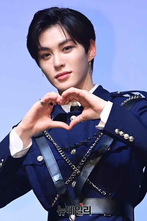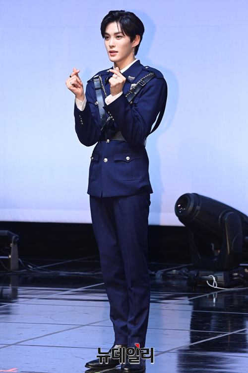 아이돌그룹 이펙스 멤버 아민이 11일 오후 서울 서대문구 이화여대 삼성홀에서 열린 세 번째 미니앨범 '불안의 서 챕터 1. '21세기 소년들'' 발매 기념 쇼케이스에서 포즈를 취하고 있다.