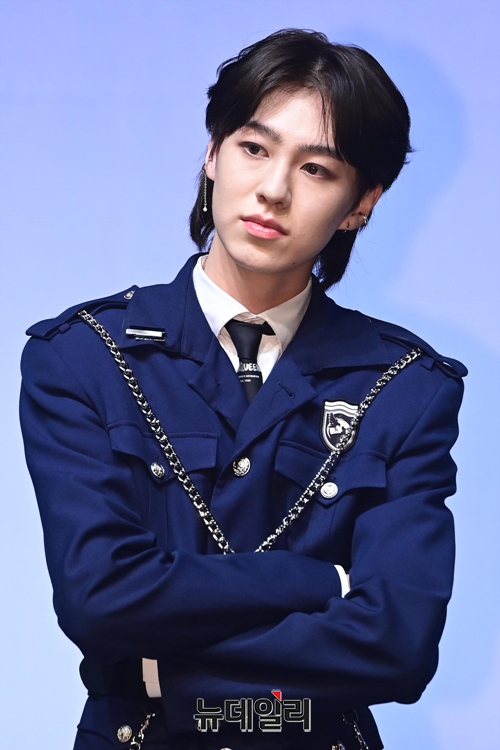 아이돌그룹 이펙스 멤버 에이든이 11일 오후 서울 서대문구 이화여대 삼성홀에서 열린 세 번째 미니앨범 '불안의 서 챕터 1. '21세기 소년들'' 발매 기념 쇼케이스에서 포즈를 취하고 있다.