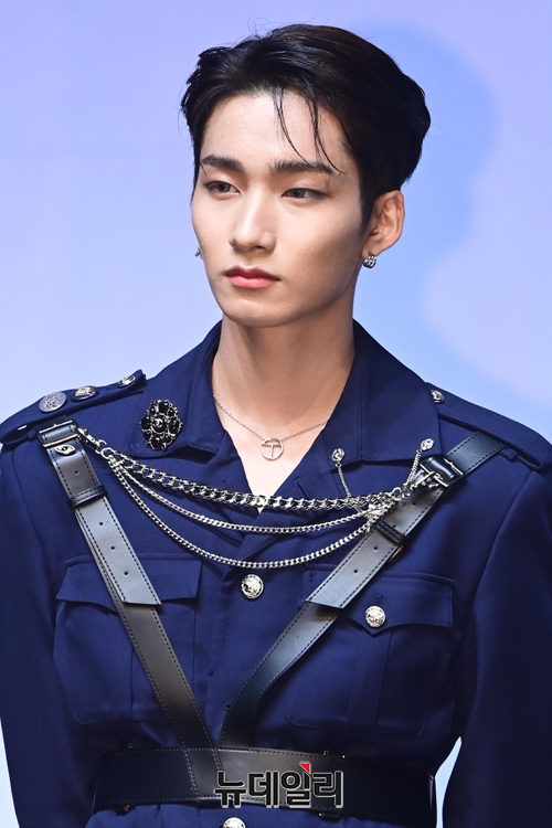 아이돌그룹 이펙스 멤버 제프가 11일 오후 서울 서대문구 이화여대 삼성홀에서 열린 세 번째 미니앨범 '불안의 서 챕터 1.-21세기 소년들' 발매 기념 쇼케이스에서 포즈를 취하고 있다.