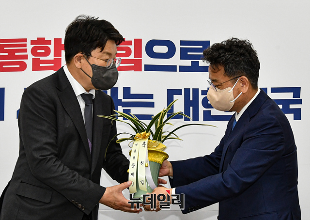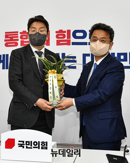 이철희 청와대 정무수석이 11일 오후 국회에서 권성동 국민의힘 신임 원내대표에게 문재인 대통령이 보낸 취임 축하 난을 전달하고 있다. (사진=공동취재단)