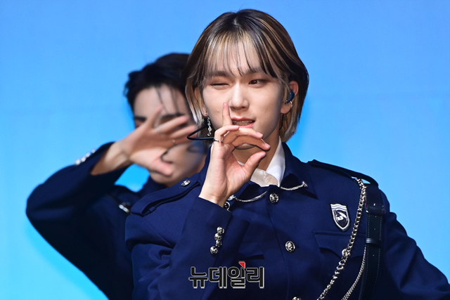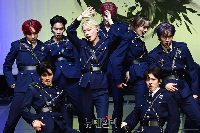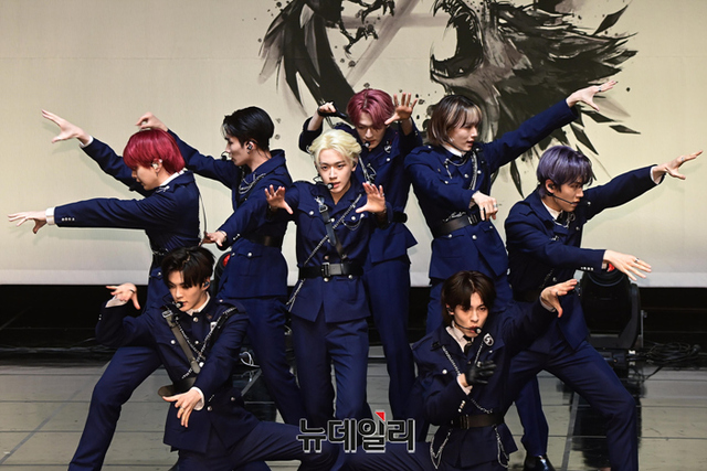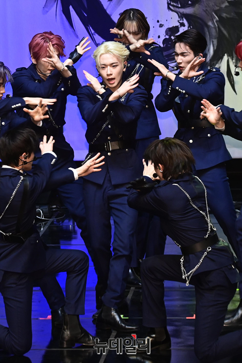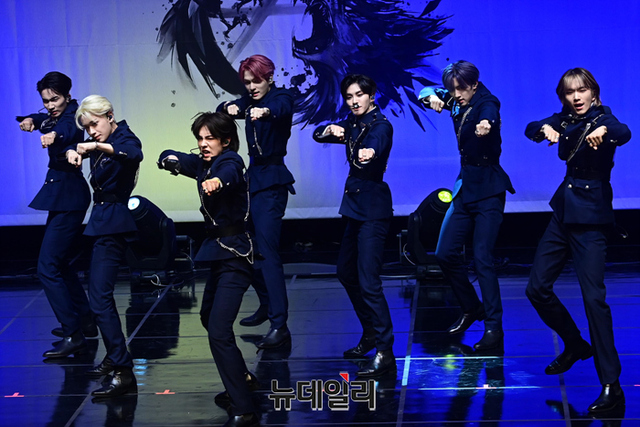 아이돌그룹 이펙스(위시, 금동현, 뮤, 아민, 백승, 에이든, 예왕, 제프)가 11일 오후 서울 서대문구 이화여대 삼성홀에서 열린 세 번째 미니앨범 '불안의 서 챕터 1.-21세기 소년들' 발매 기념 쇼케이스에서 무대를 선보이고 있다.