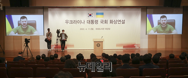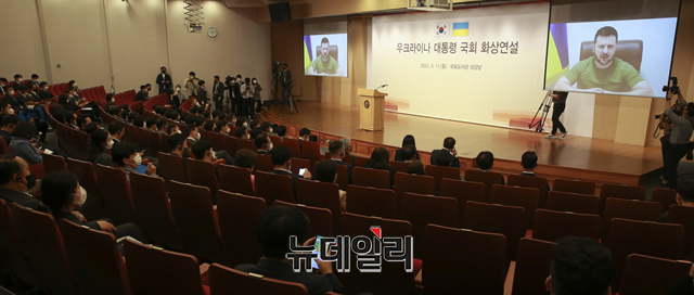 러시아의 침공을 받고 있는 우크라이나 볼로디미르 젤렌스키 대통령이 11일 오후 국회 도서관 대강당에서 화상연설을 하고 있다.