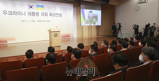 이날 젤렌스키 대통령은 한국을 향해선 국제사회와 함께 6·25 전쟁을 이겨낸 경험을 언급하며 군사적 지원과 지지를 호소했다. (사진=공동취재단)