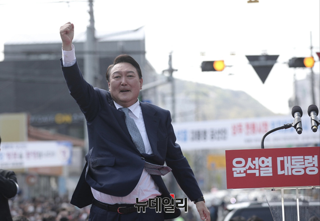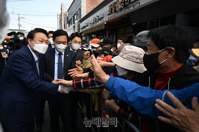 경북지역을 방문중인 윤석열 대통령이 당선인이 11일 오후 경북 상주시 중앙시장에서 시민들에게 인사를 하고 있다. (사진=인수위)