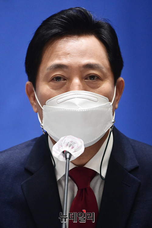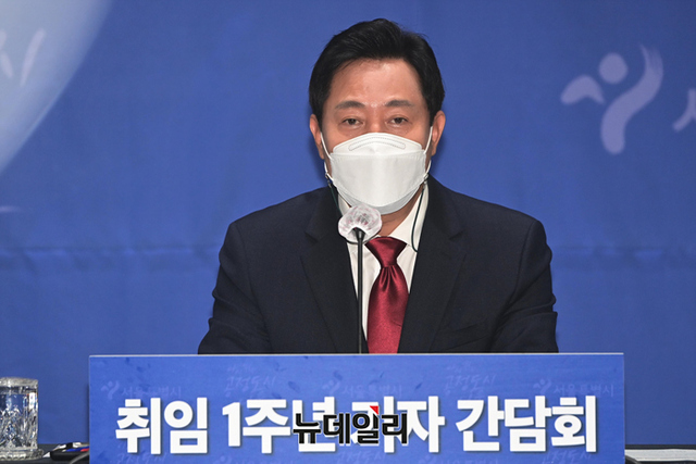 오세훈 서울시장이 12일 오전 서울 중구 서울시청 대회의실에서 열린 서울시장 취임 1주년 출입기자 간담회에서 발언을 하고 있다.
