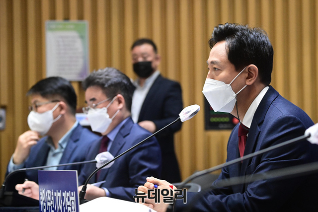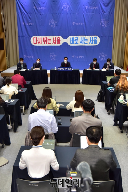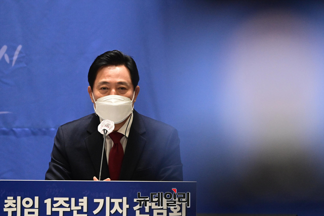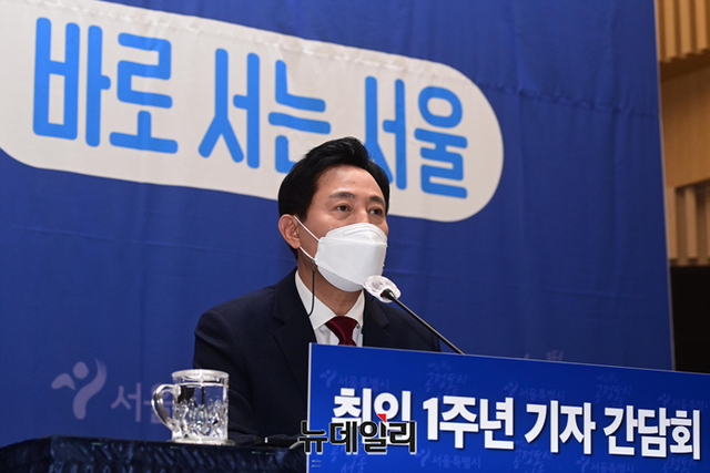 오세훈 서울시장이 12일 오전 서울 중구 서울시청 대회의실에서 열린 서울시장 취임 1주년 출입기자 간담회에서 발언을 하고 있다.