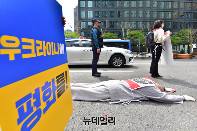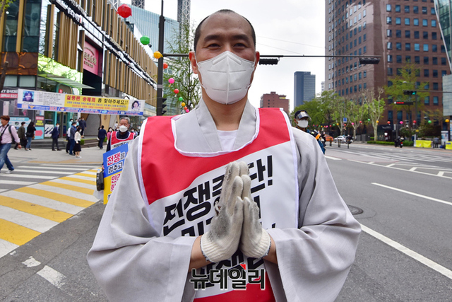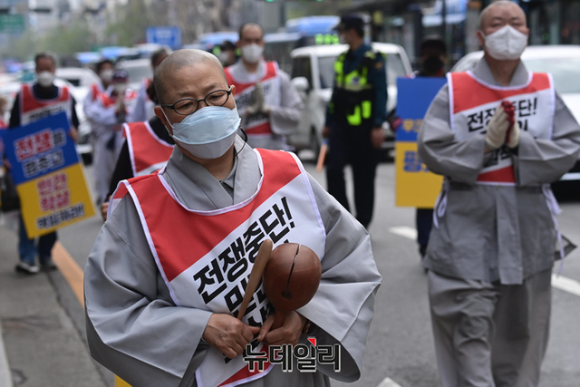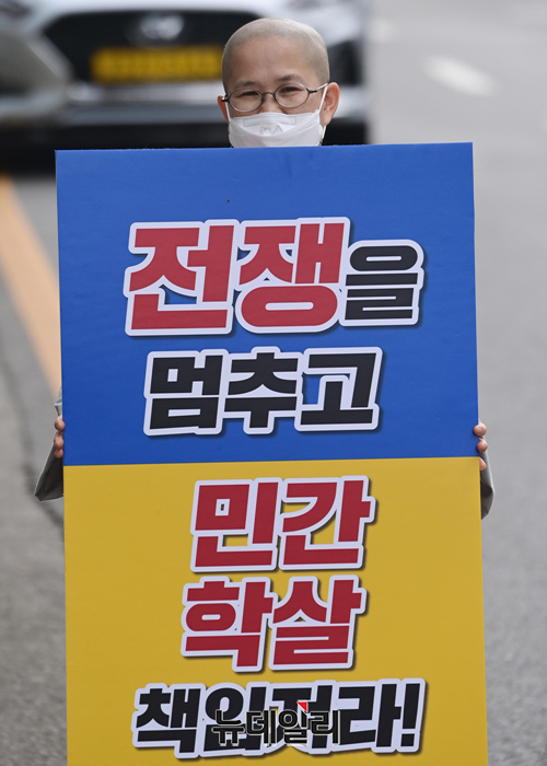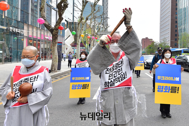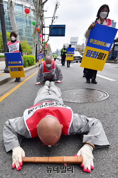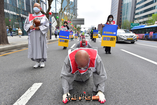 이날 참석자들은 조계사 대웅전 앞에서 출발해 주한러시아대사관 인근 정동제일교회까지 3보마다 오체투지를 하며 행진했다.