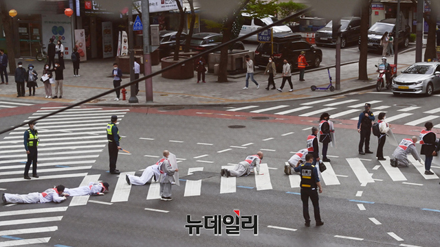 대한불교조계종 사회노동위원회 지몽스님 등이 12일 오전 서울 종로구 조계사 인근에서 우크라이나 평화를 기원하며 오체투지 행진을 하고 있다.